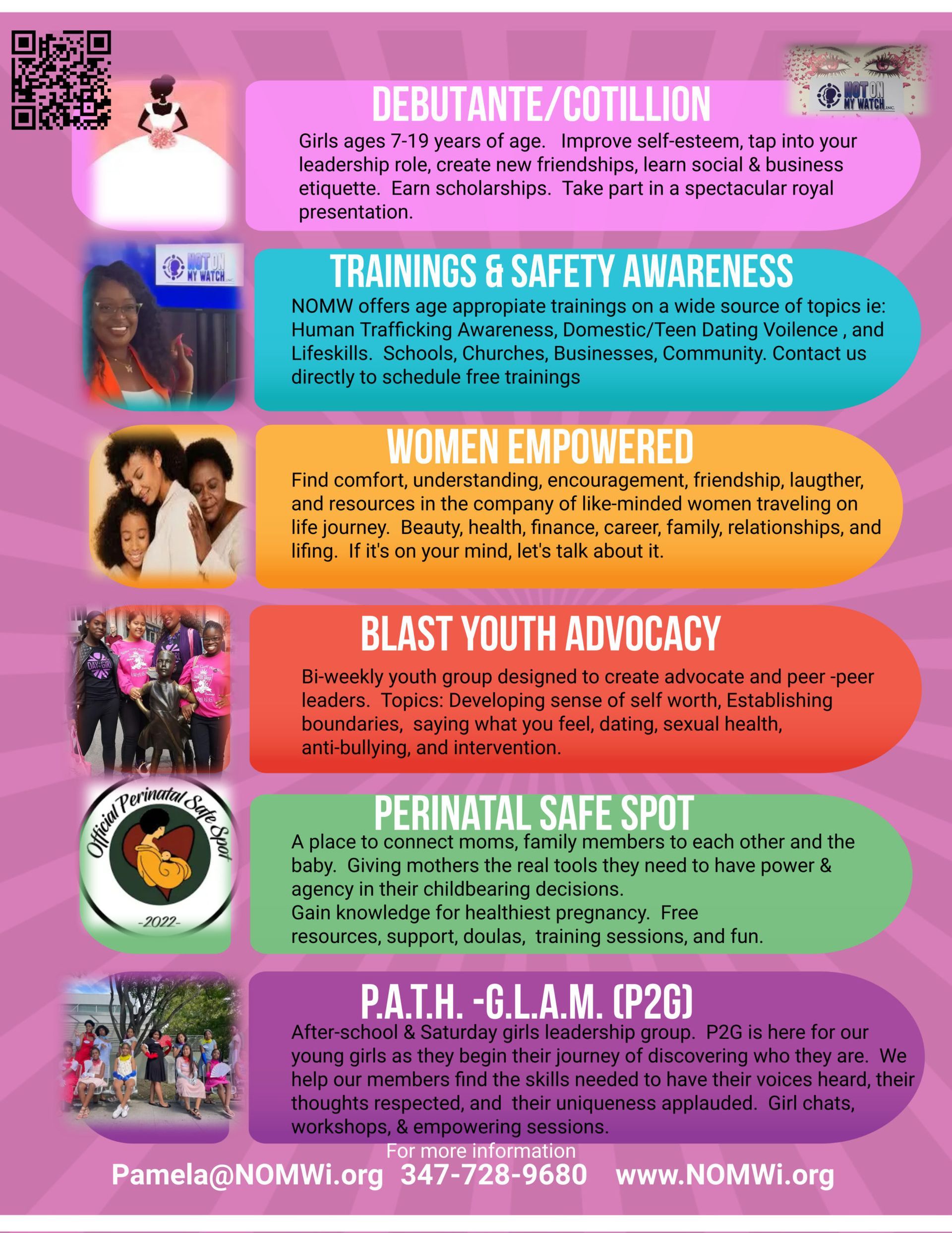 The Women & Family Support program offered by Not On My Watch (NOMW) is a dedicated platform designed to provide support, guidance, and camaraderie for individuals aged 20 and above, navigating various stages of life, parenting, relationships, and personal growth. Here's an outline reflecting the essence and structure of W.E.: